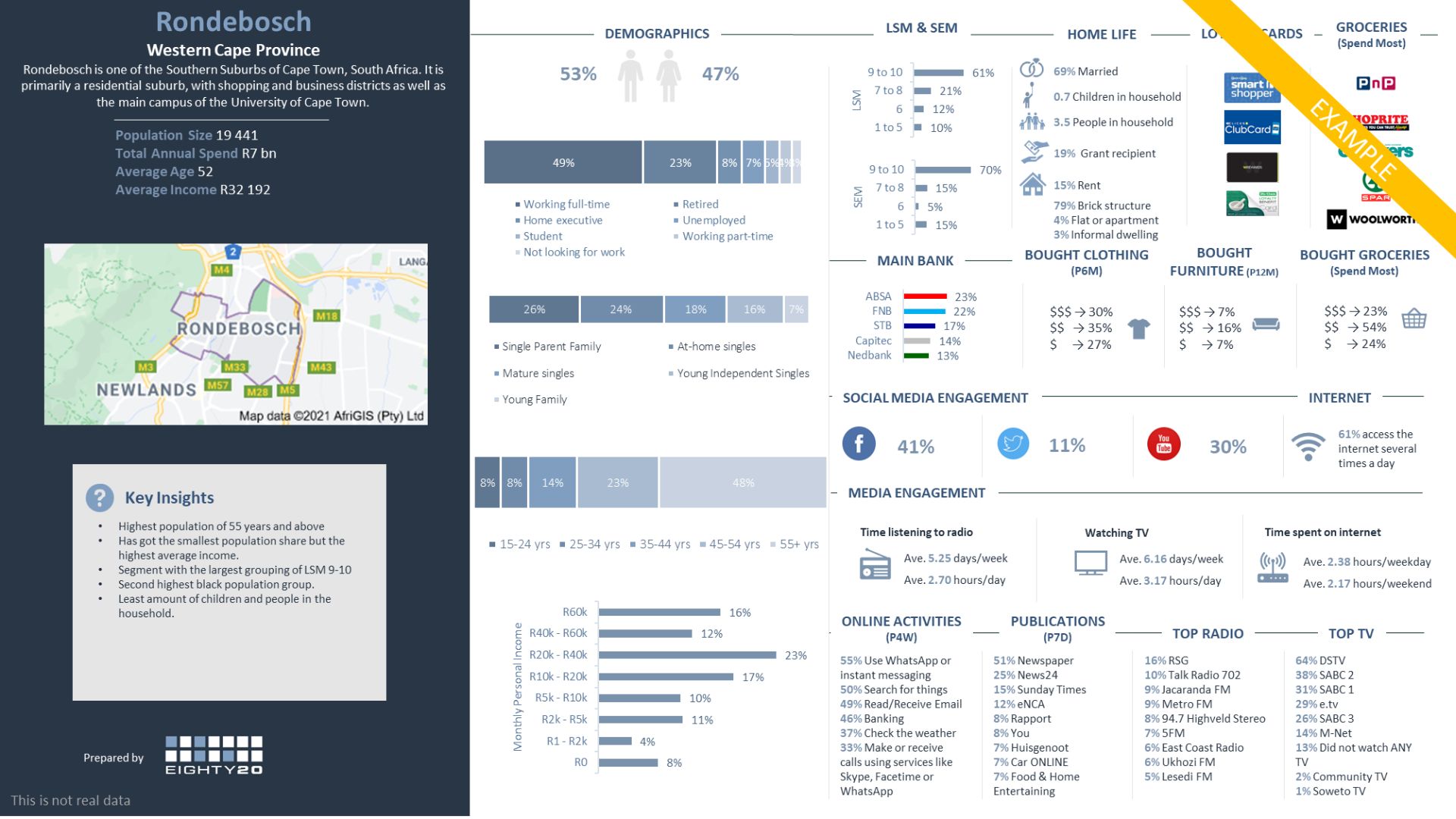 The Eighty20 National Segmentation (ENS), draws from multiple data sources, including Credit Bureau data, to create South Africa’s most powerful customer profiling and enrichment tool – mapping over 1,000 external variables (demographics, behaviours, affinities, purchase propensities, and more) to your customer records – securely and compliantly.