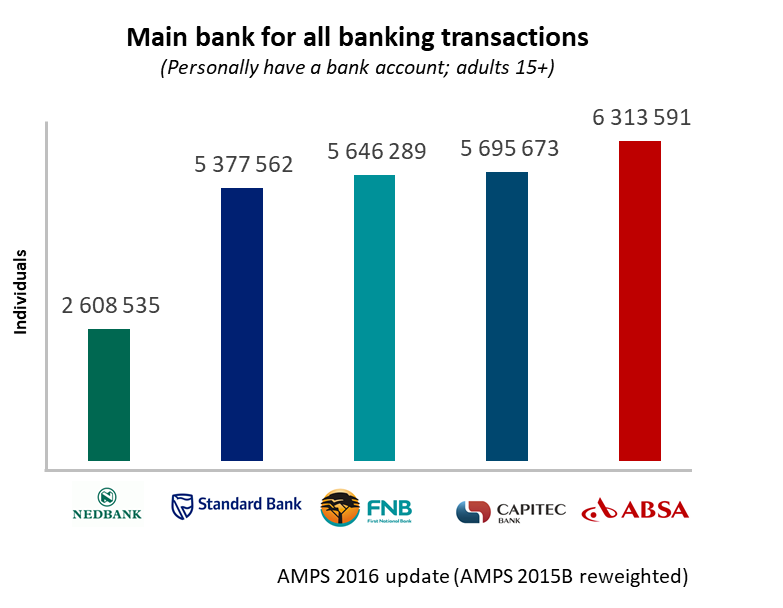 The reweighted AMPS has been released, and since it was only the demographics that have been updated, it was unexpected that there would be brand movement as well. Despite this, Capitec has overtaken FNB to claim the position as the second biggest bank in South Africa, by number of customers, based on the survey question “What is your main bank for all banking transactions“. In the 2015B AMPS release, Capitec was in third place on the ‘Main Bank’ variable but had already moved into the second position on the multiple response variable ‘Financial Institution’ which accounts for those who have multiple bank accounts.