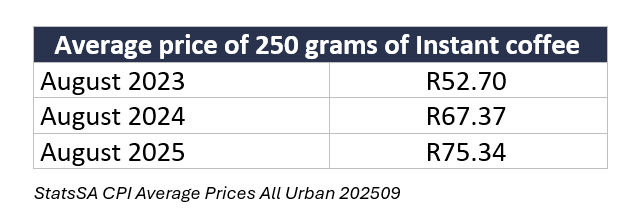 While inflation abates, prices do still rise. The average price for 250 grams of Instant coffee over the past 3 years has shown a compound annual growth rate of 12.65%: